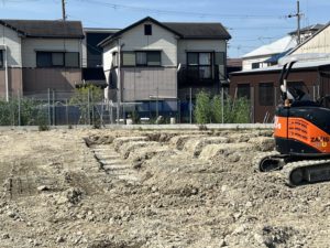 基礎の掘削: 大型の掘削機が現場に到着し、基礎の掘削作業が始まりました。深さや幅を計画通りに掘り進めています。